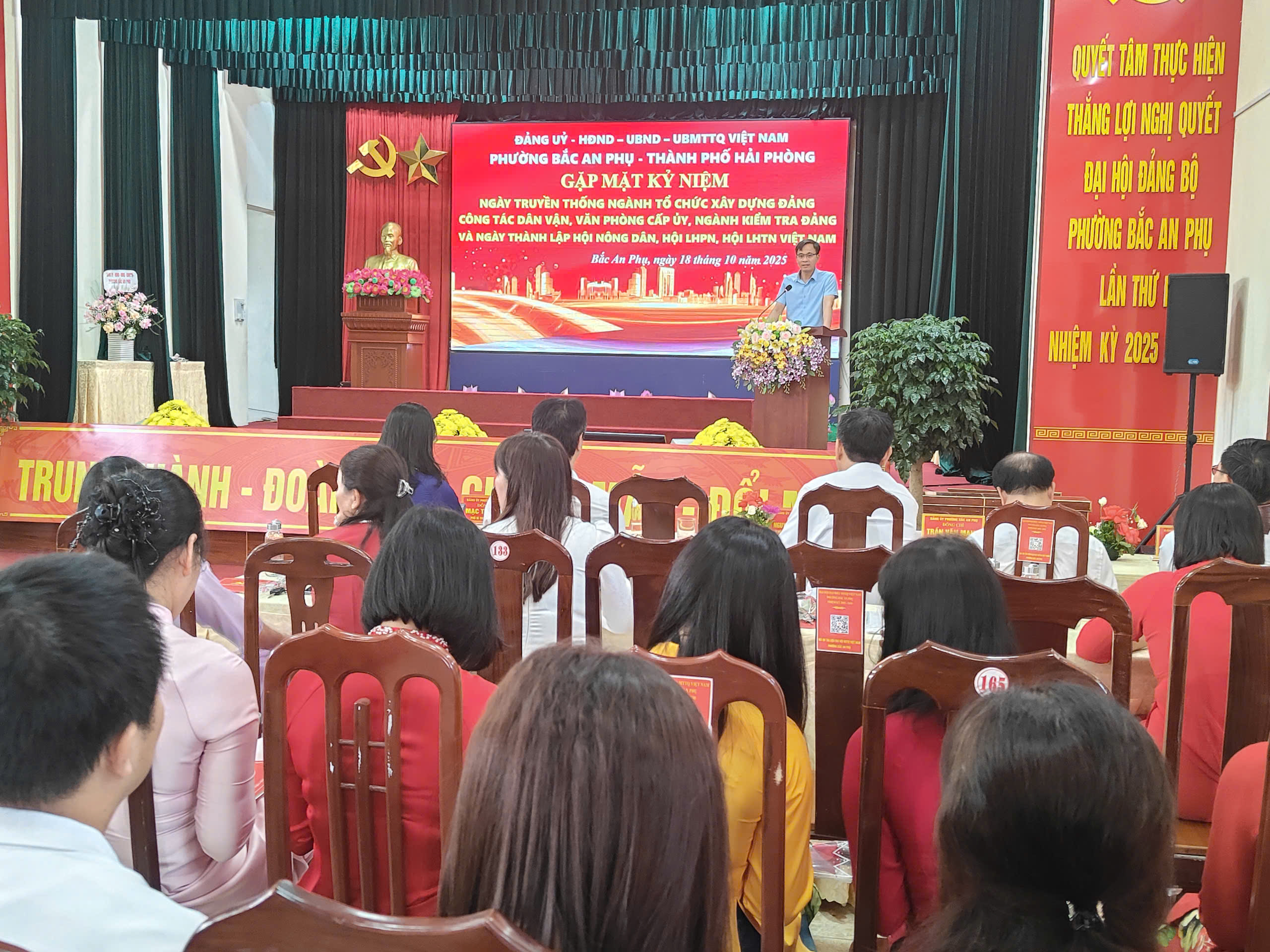 Sáng ngày 18 tháng 10, tại Nhà văn hoá Trung tâm phường, Đảng uỷ-HĐND-UBND-Uỷ ban MTTQ Việt Nam phường Bắc An Phụ gặp mặt kỷ niệm ngày truyền thống ngành tổ chức xây dựng Đảng, Công tác dân vận, Văn phòng cấp uỷ, ngành kiểm tra Đảng và ngày thành lập Hội nông dân, Hội liên hiệp phụ nữ, Hội liên hiệp thanh niên Việt Nam. Về dự có đồng chí Bùi Hải Bằng, Bí thư Đảng uỷ, chủ tịch HĐND phường; đồng chí Trần Văn Pha, Phó bí thư Thường trực Đảng uỷ; đồng chí Mạc Thị Huyền, Phó bí thư Đảng uỷ, chủ tịch UBND phường; các đồng chí trong Ban thường vụ Đảng uỷ, thường trực HĐND, lãnh đạo UBND; các đồng chí cán bộ, công chức, viên chức khối Đảng, Chính Quyền, MTTQ và các đoàn thể.