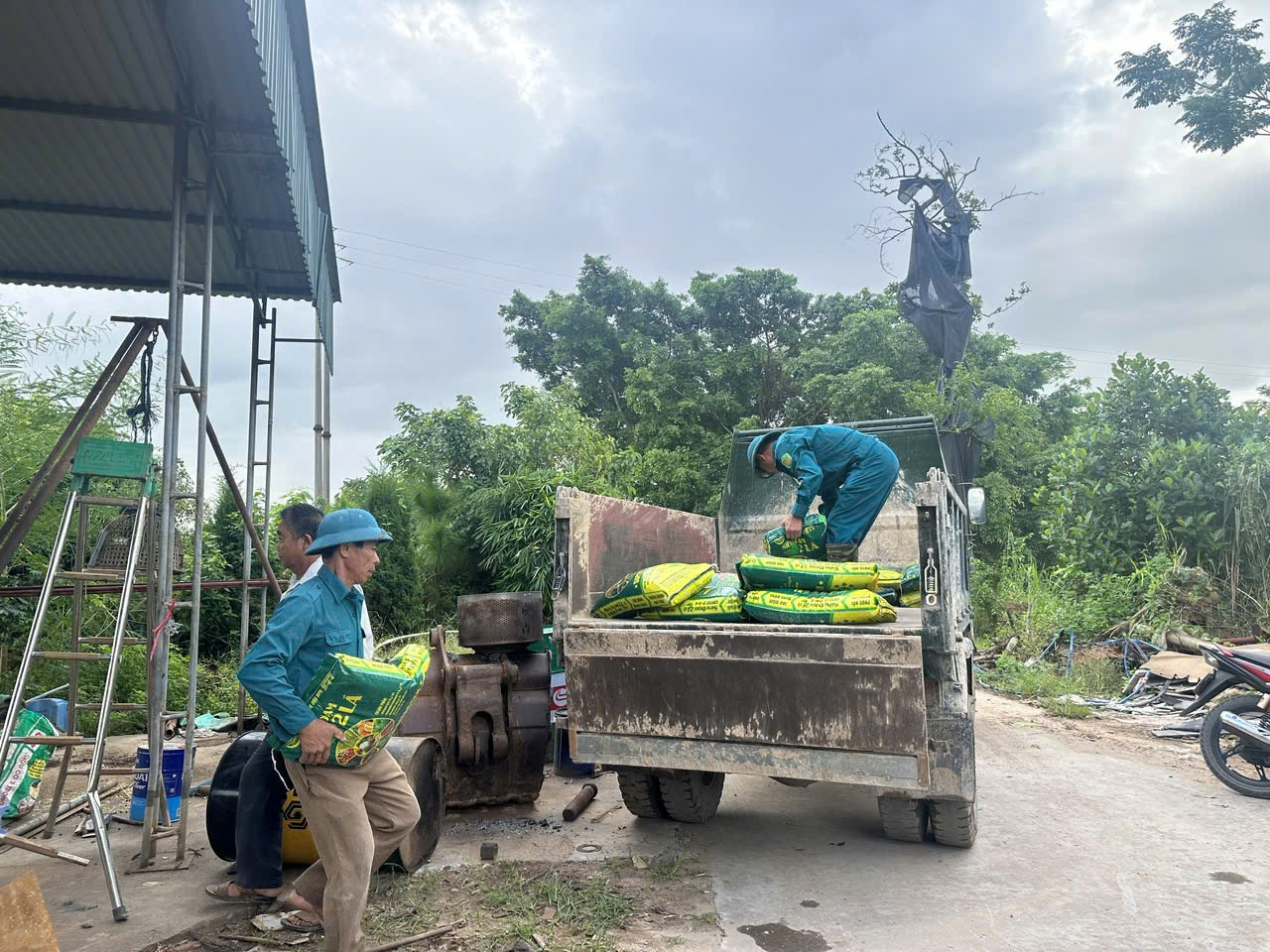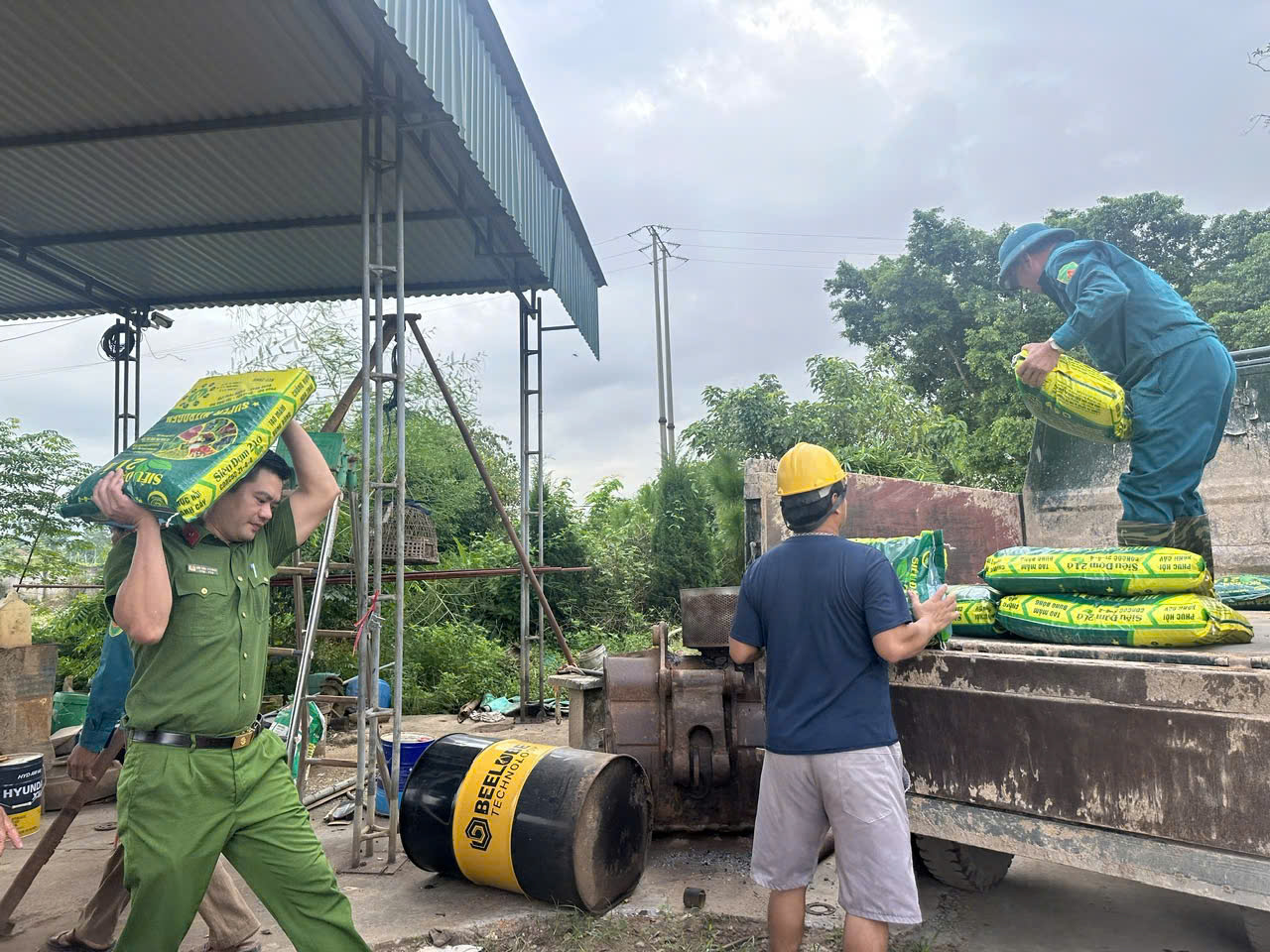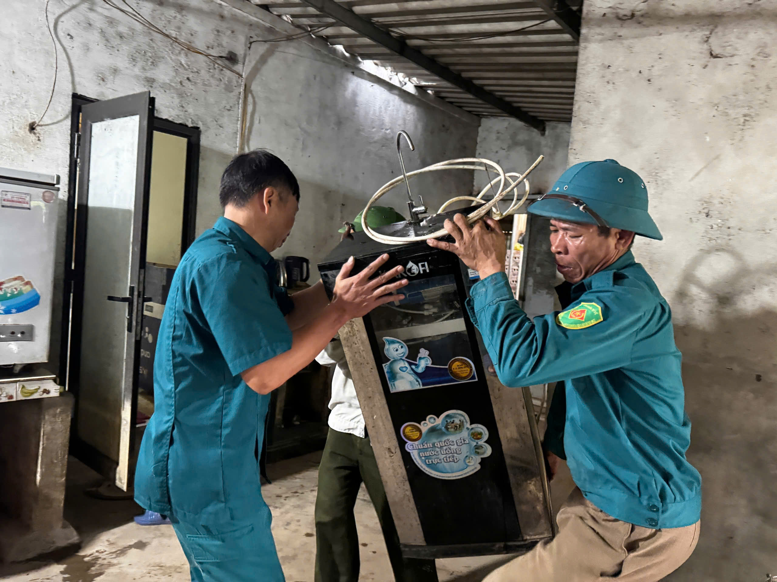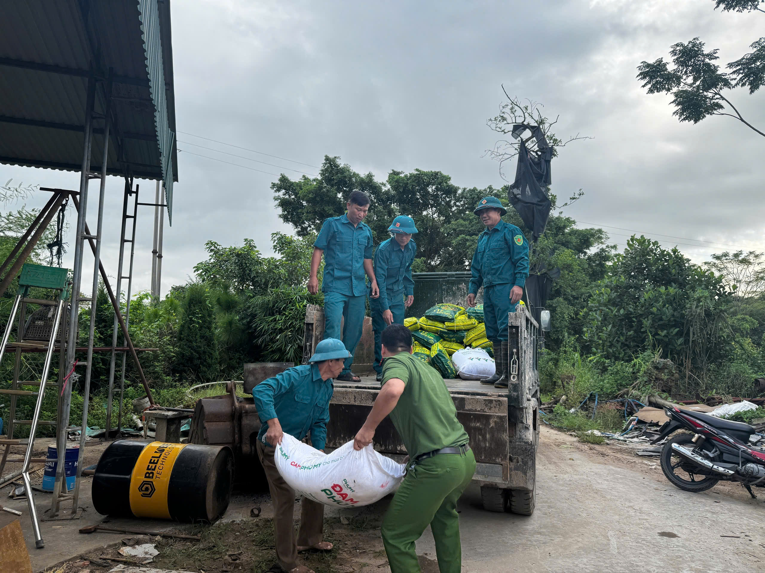 Các lực lượng Công an, Quân sự, Tổ dân phố hỗ trợ nhân dân khu vực ngoài đê di chuyển tài sản đến nơi an toàn