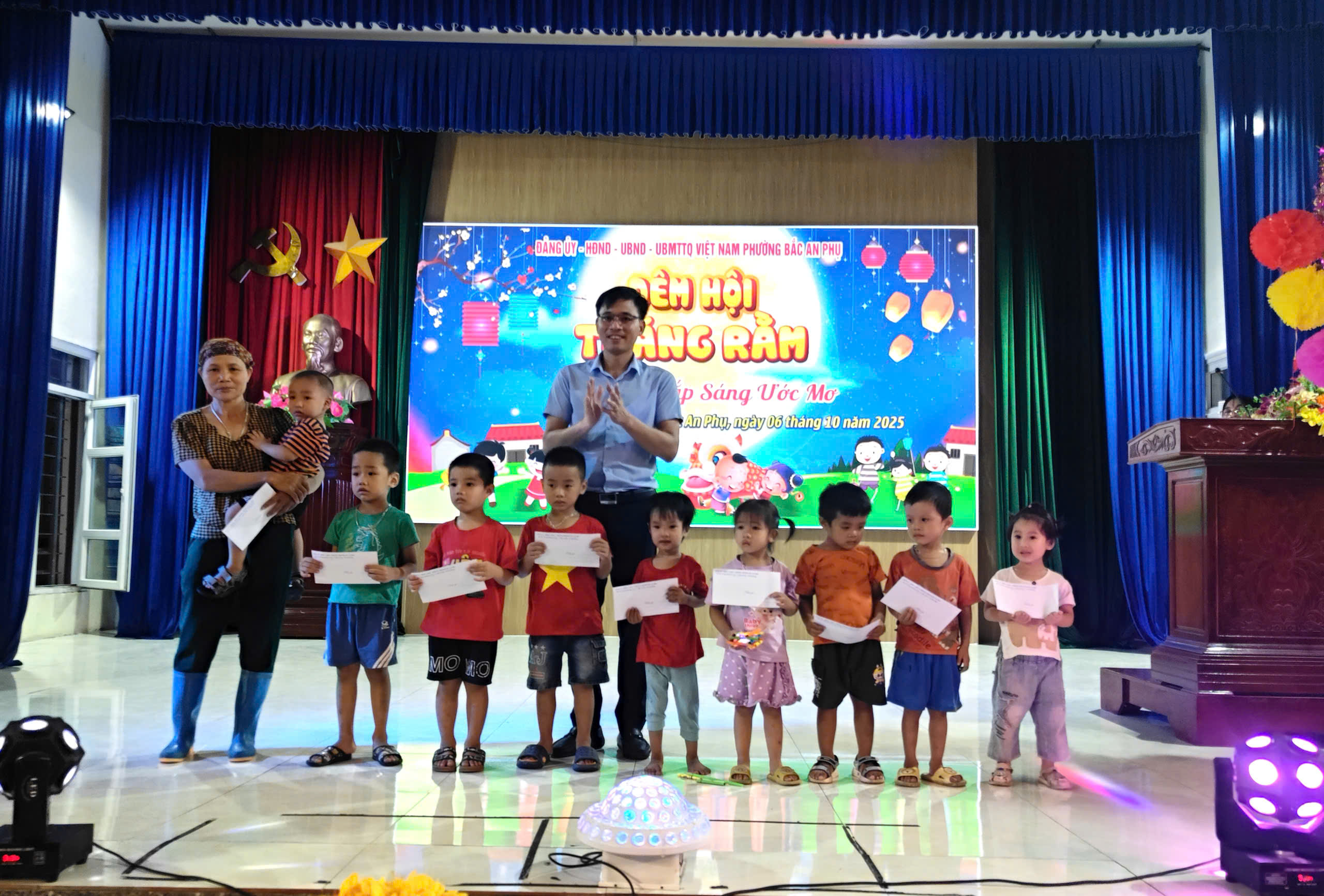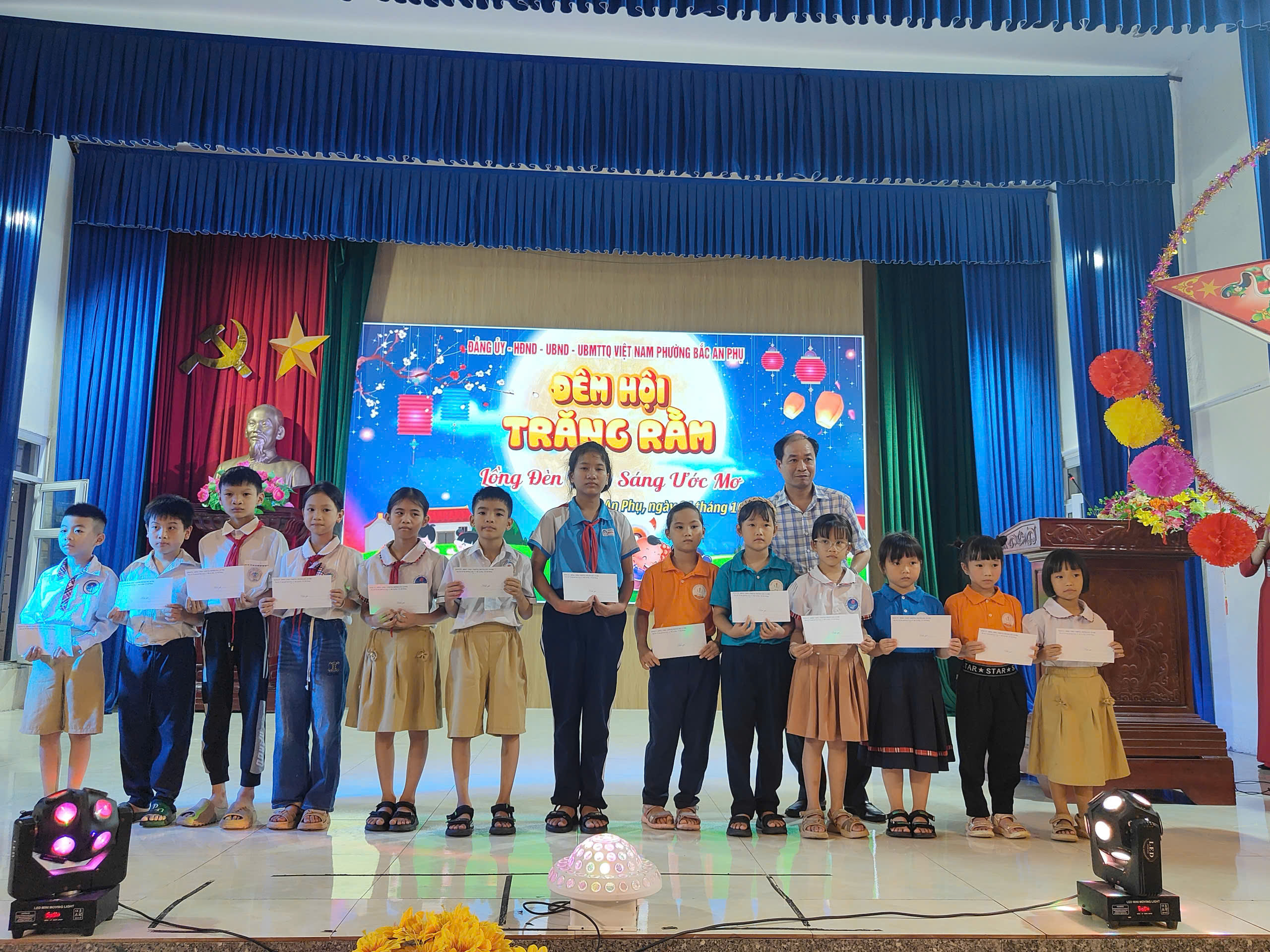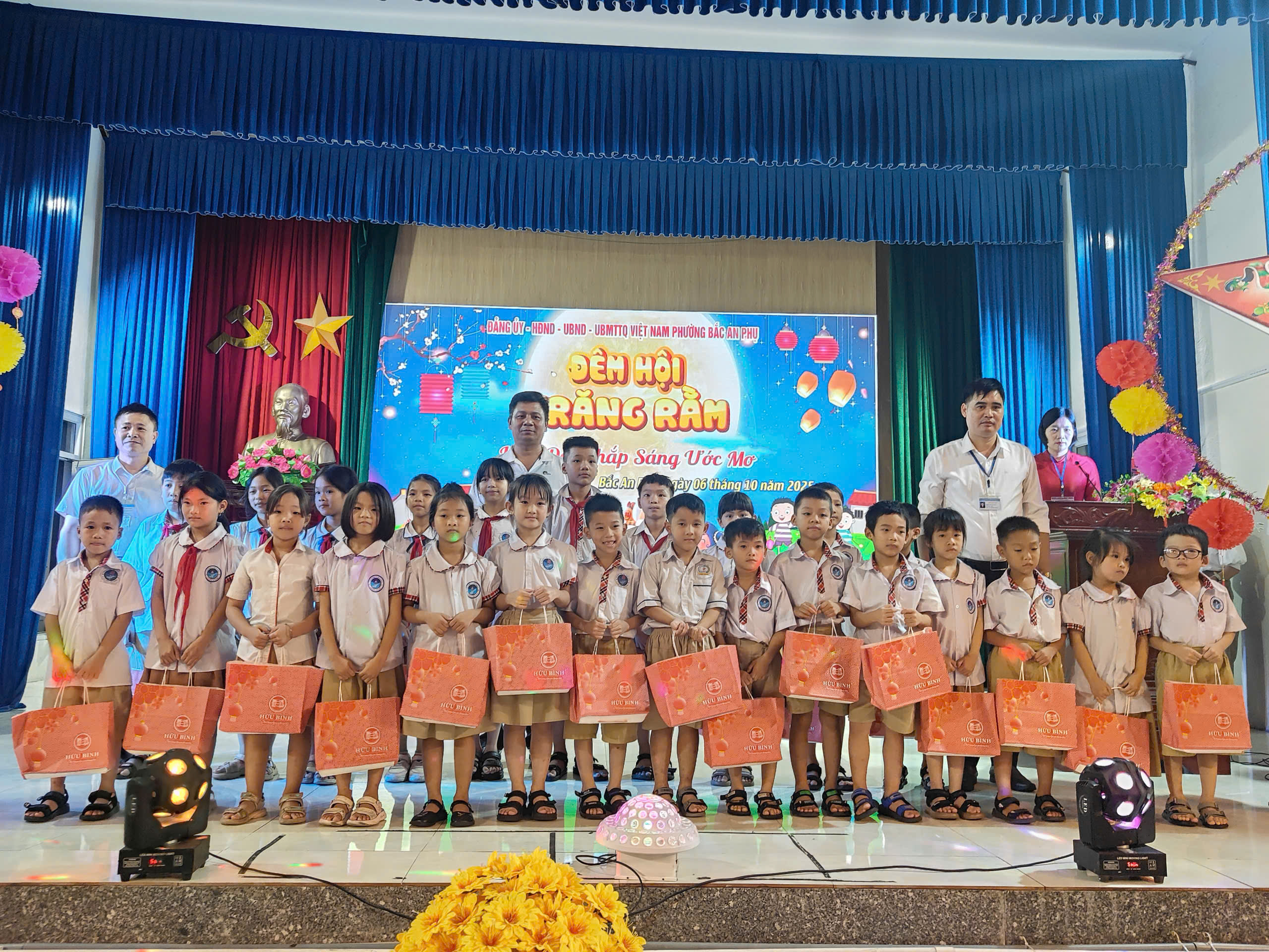 Tại chương trình, các đại biểu và các em học sinh được nghe Thư của Chủ tịch nước gửi các cháu Thiếu niên và Nhi đồng nhân dịp Tết Trung thu năm 2025; đồng thời được thưởng thức các tiết mục văn nghệ, tiểu phẩm Chú cuội- Chị Hằng, xem Múa lân, cùng phá cỗ Trung thu truyền thống, mang lại niềm vui, sự hào hứng cho các em nhỏ. Dịp này, các đồng chí lãnh đạo phường Bắc An Phụ đã trao 45 suất quà cho các em học sinh có hoàn cảnh khó khăn.