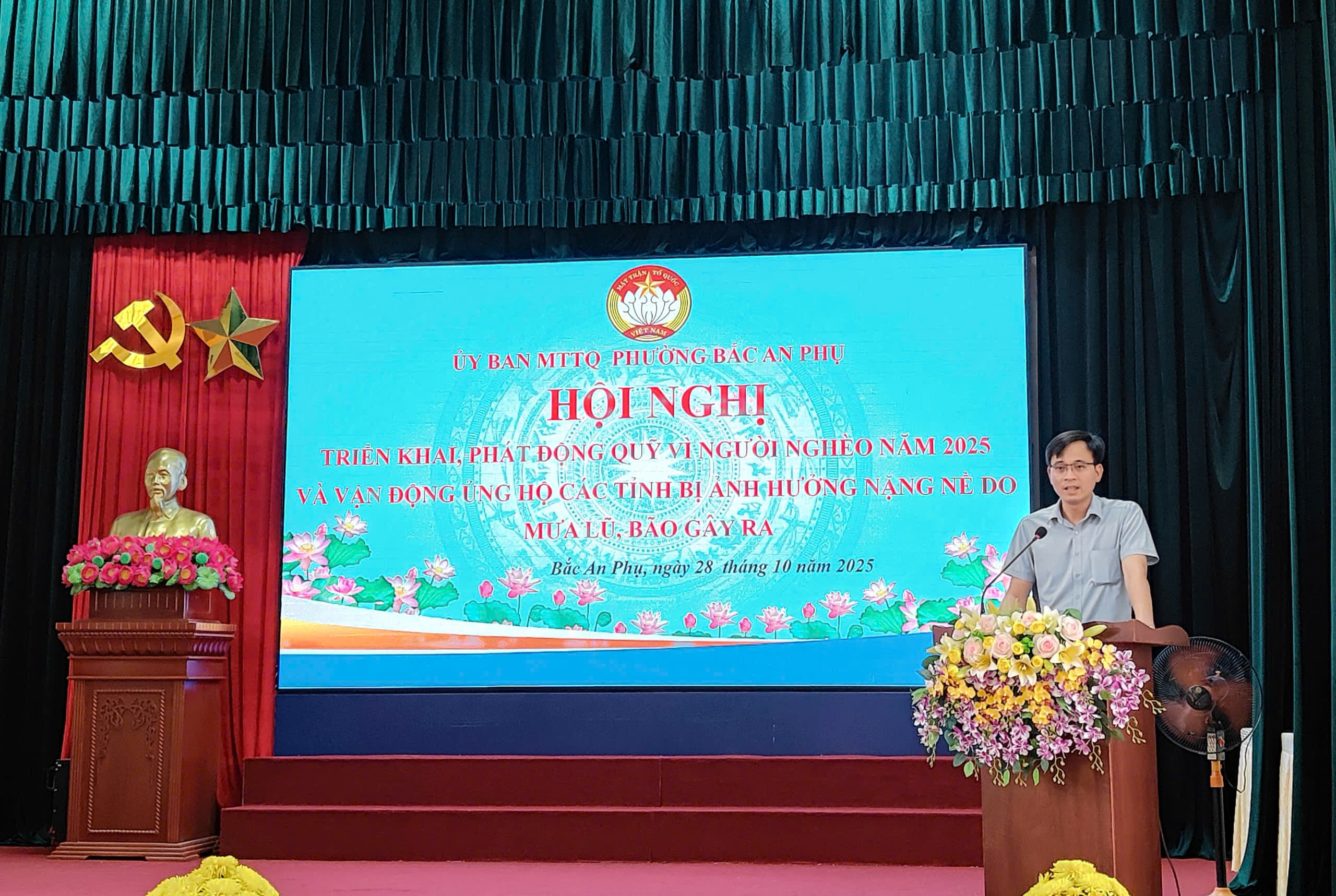 Phát biểu tại hội nghị, đồng chí Bùi Hải Bằng, Bí thư Đảng uỷ, chủ tịch HĐND phường đề nghị Uỷ ban MTTQ Việt Nam phường phát huy vai trò, trách nhiệm của hệ thống Mặt trận trong công tác tập hợp, đoàn kết, phát huy sức mạnh khối đại đoàn kết toàn dân tộc; thể hiện tinh thần nhân ái, nghĩa tình của cán bộ, đảng viên và các tầng lớp Nhân dân phường Bắc An Phụ, góp phần hỗ trợ, chia sẻ khó khăn với những hộ dân có hoàn cảnh khó khăn trên địa bàn phường có nhà ở ổn định, sinh kế phát triển, giúp đồng bào vùng bị thiên tai khắc phục hậu quả, sớm ổn định cuộc sống, phục hồi sản xuất, kinh doanh. Đồng chí Bí thư Đảng uỷ giao nhiệm vụ cho thành Ban vận động Quỹ “Vì người nghèo” và Ủng hộ quỹ hỗ trợ Nhân dân bị thiệt hại do bão lũ tích cực làm tốt công tác tuyên truyền, tạo hiệu ứng lan toả tích cực về tinh thần tương thân thương ái.