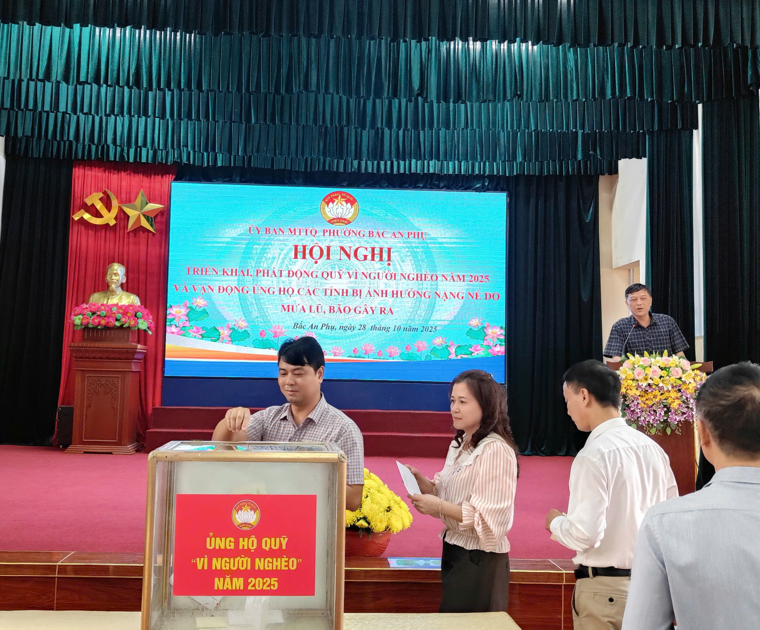 Chiều ngày 28 tháng 10, tại Nhà văn hoá trung tâm phường, Uỷ ban MTTQ Việt Nam phường Bắc An Phụ tổ chức Hội nghị phát động Tháng cao điểm vì Người nghèo và An sinh xã hội, triển khai Kế hoạch vận động Quỹ “Vì người nghèo” và Ủng hộ quỹ hỗ trợ Nhân dân bị thiệt hại do bão lũ. Về dự chỉ đạo Hội nghị có đồng chí Bùi Hải Bằng, Bí thư Đảng uỷ, Chủ tịch HĐND phường; đồng chí Trần Văn Pha, Phó Bí thư Thường trực Đảng uỷ; đồng chí Mạc Thị Huyền, Phó Bí thư Đảng uỷ, Chủ tịch UBND phường; các đồng chí trong Ban thường vụ Đảng uỷ, Thường trực HĐND, lãnh đạo UBND, Lãnh đạo các phòng, ban, ngành, đoàn thể, Bí thư chi bộ, Tổ trưởng tổ dân phố, Ban công tác mặt trận Tổ dân phố.